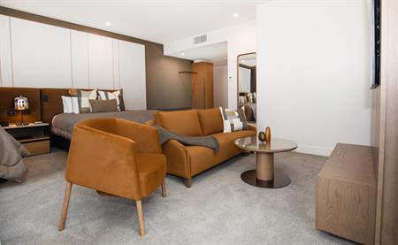 These spacious sophisticated suites prioritise pampering, with a luxurious bathroom featuring a freestanding bathtub, luxurious dual fixture walk-in rain shower, a sleek modern vanity with 2 basins and complimentary Distinction toiletries.