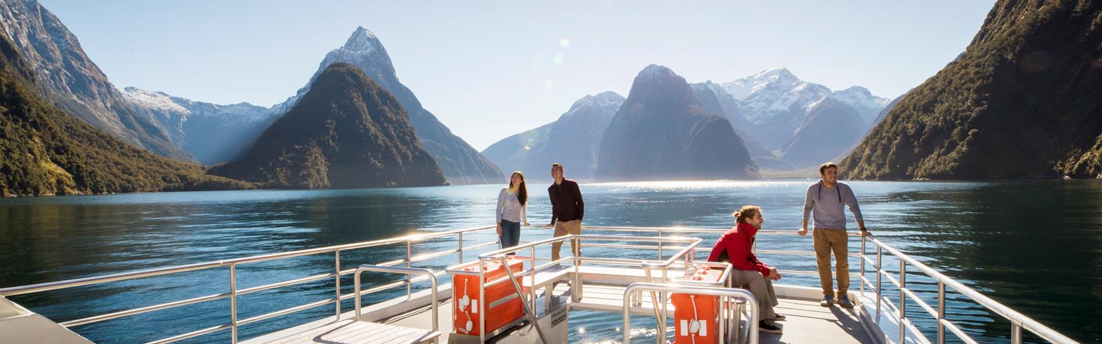 The fiord is approximately 16km from the 'head' to the open sea, meaning visitors can comfortably travel via one of the cruise operators from the Milford Wharf out to the Tasman Sea and return in only 1.5 to 2 hours. Cruise passengers get the opportunity to view scenic highlights such as Mitre Peak, Pembroke Glacier, Lady Bowen and Stirling Falls. Playing dolphins and fur seals basking on the rocks are a common sight. There are a number of operators offering various Milford Sound Cruises including